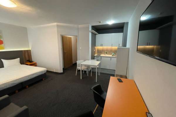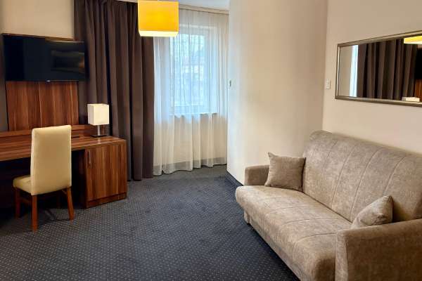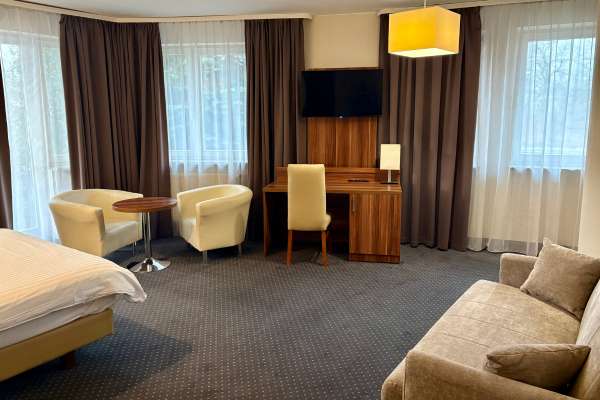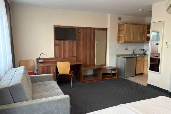 Superior rooms – a room of 50m2 for 2 to 3 guests. The room is equipped with air-conditioning, desk, closet/wardrobe, ironing set, TV with cable TV, kettle and coffee/tea making facilities. In the bathroom: shower, free toiletries, towels, hairdryer. The room is equipped with a kitchenette.