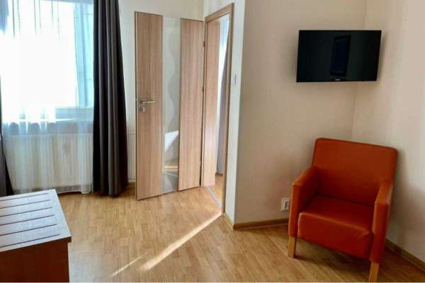 Deluxe rooms – a room of 30m2 for 2 to 3 guests. The room is equipped with a desk, closet/wardrobe, ironing set, TV with cable TV, kettle and coffee/tea making facilities. In the bathroom: bathtub or shower, free toiletries, towels, hairdryer. The room is equipped with a kitchenette.